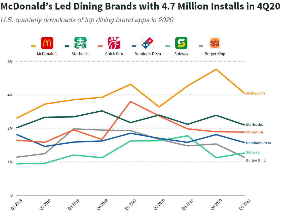 根据 Sensor Tower 的监测数据,美国餐饮服务商的品牌 App 下载排名中,麦当劳一直位居首位。