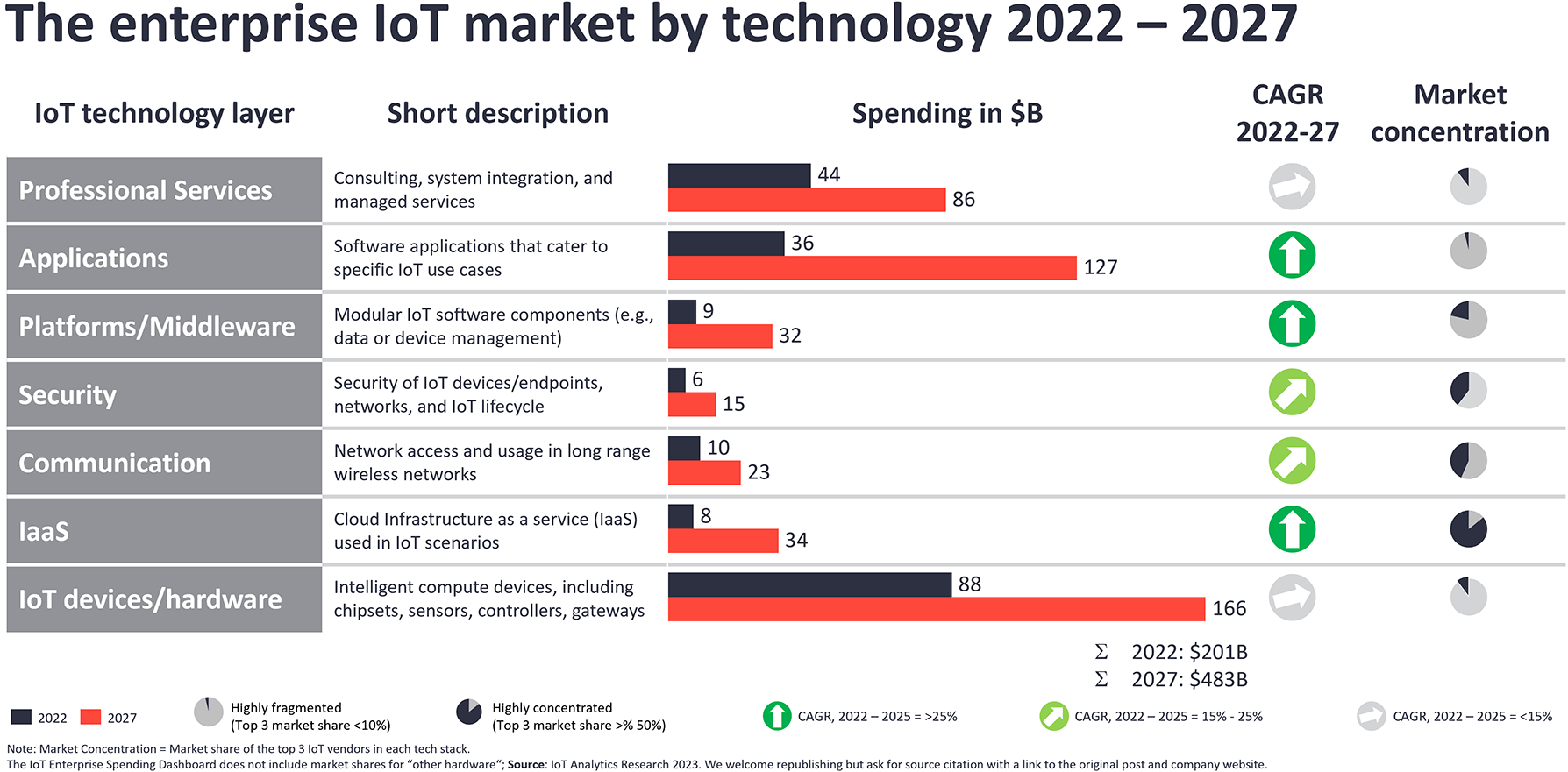 研究机构 IoT Analytics 数据显示,2024 年全球 IoT 专业服务的市场空间为 560 亿美元。预测到 2030 年总空间可达 1,250 亿美元,CAGR 增长率为 14%。