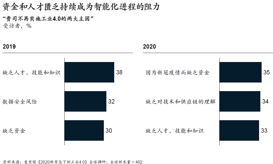 Mckinsey 认为流程行业在智能化推进的 “组织和能力建设” 方面投入普遍不足。除少部分企业开始筹建数字化推进组织并进行能力培养外,大部分企业仍按兵不动,寄希望 “购买” 成熟的解决方案,致使人才、技能和知识的缺乏持续成为企业智能化转型的重要挑战。