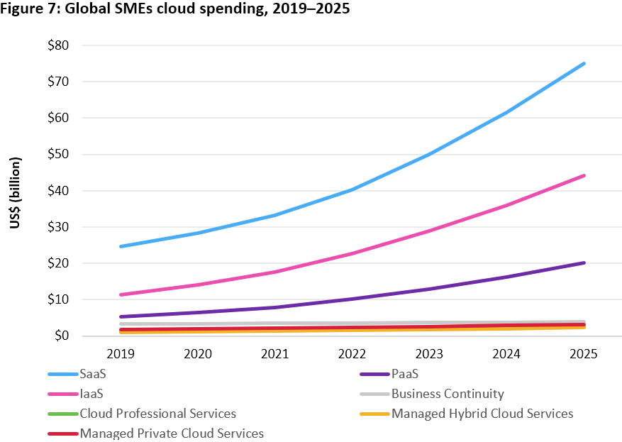 Accenture 研究显示,全球中小企业在通信网络类的开支在未来几年会停留在 CAGR 0.9% 的低增长状态,而数字化和 IT 方面的开支则会有 CAGR 8.7% 的较高增长。