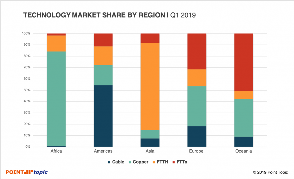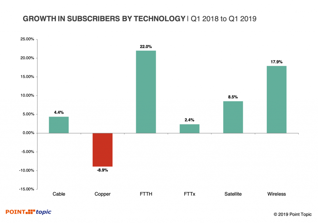 全球固定宽带总用户近年来保持在 2~2.5% 的年度增幅,其中 FTTH 保持保持了 22% 的高速增长(2019Q1 vs. 2018Q1),而 Copper 铜线(x'DSL) 则在许多地区在持续退网。