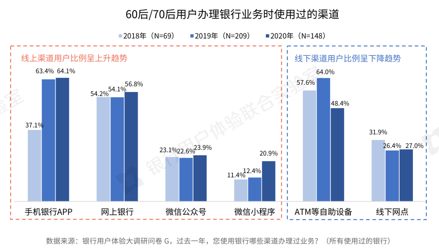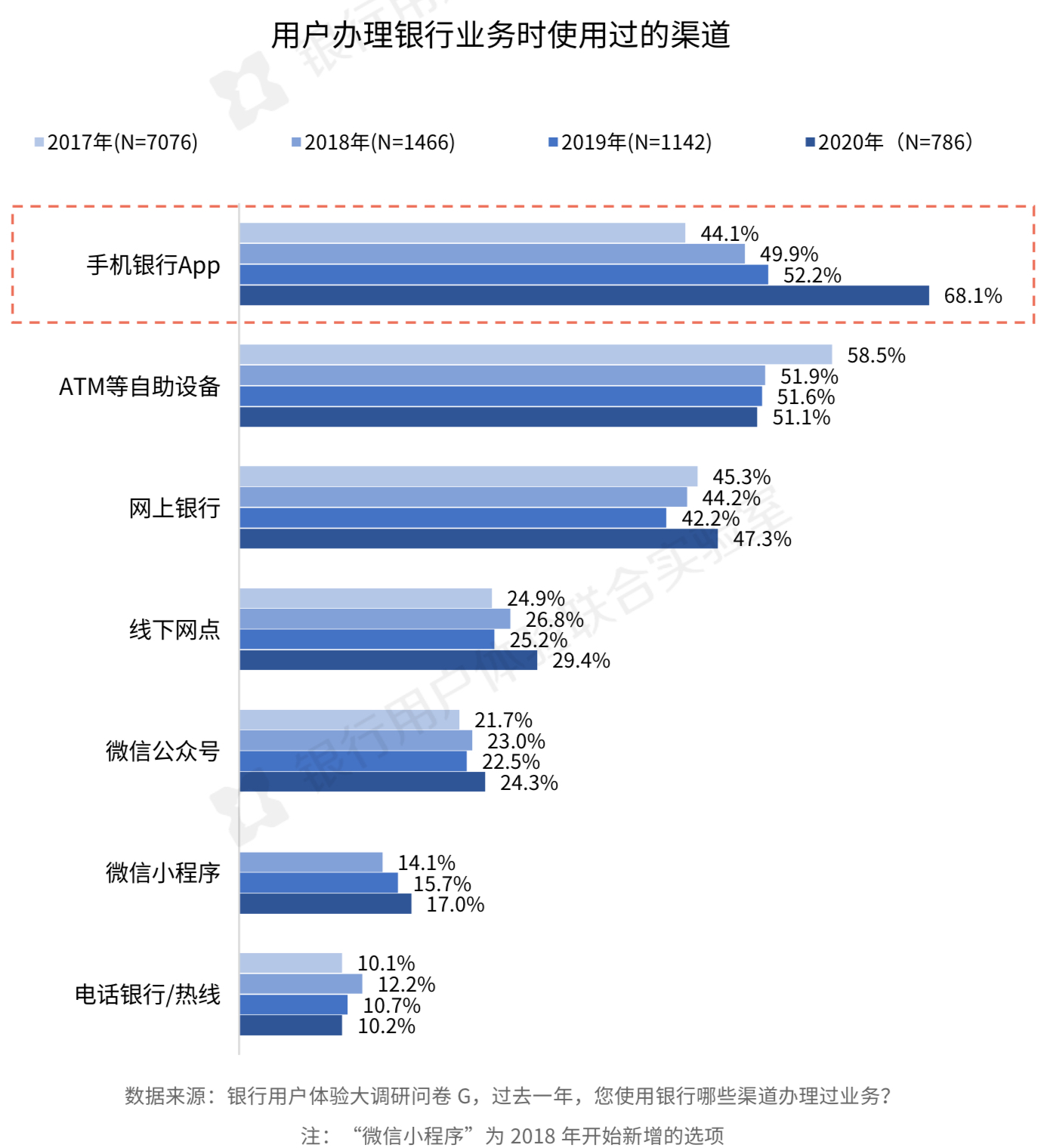来自微众银行和腾讯研究,针对用户办理银行业务的渠道选择。这项研究持续了多年,可以看到 2017~2020 用户的变化过程。