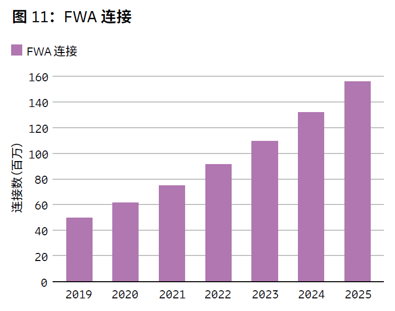 (3) 估计到 2019 年底,FWA 连接数大约为 5100 万。预计到 2025 年,这一数字将增长三倍,接近 1.6 亿。