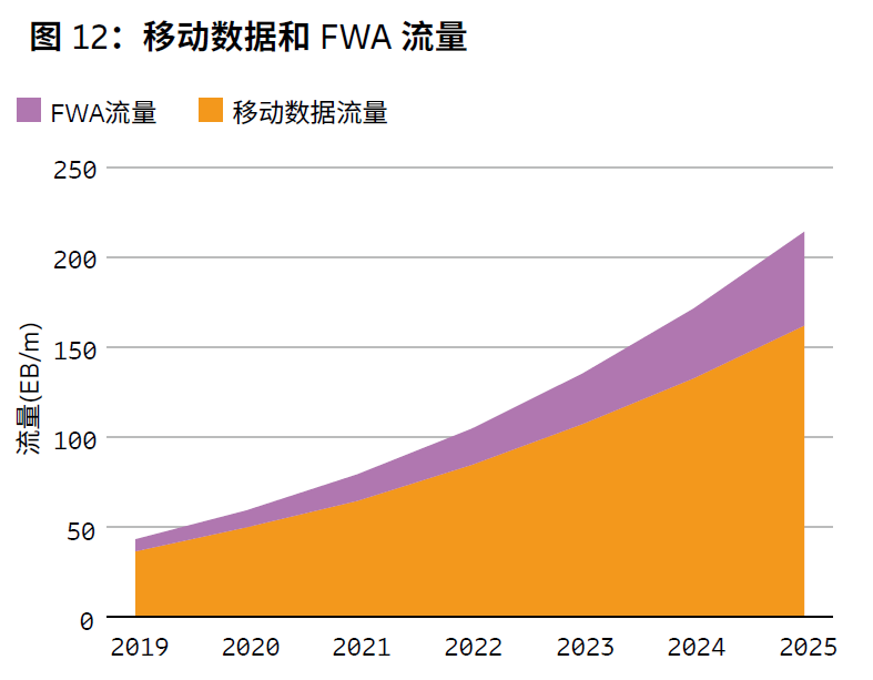 (4) 到 2019 年底,FWA数据流量约占到全球移动网络数据总流量的15%左右。预计到 2025 年,这一数字将增长约 8 倍,达到 53EB,占到全球移动网络数据总流量的 25%。