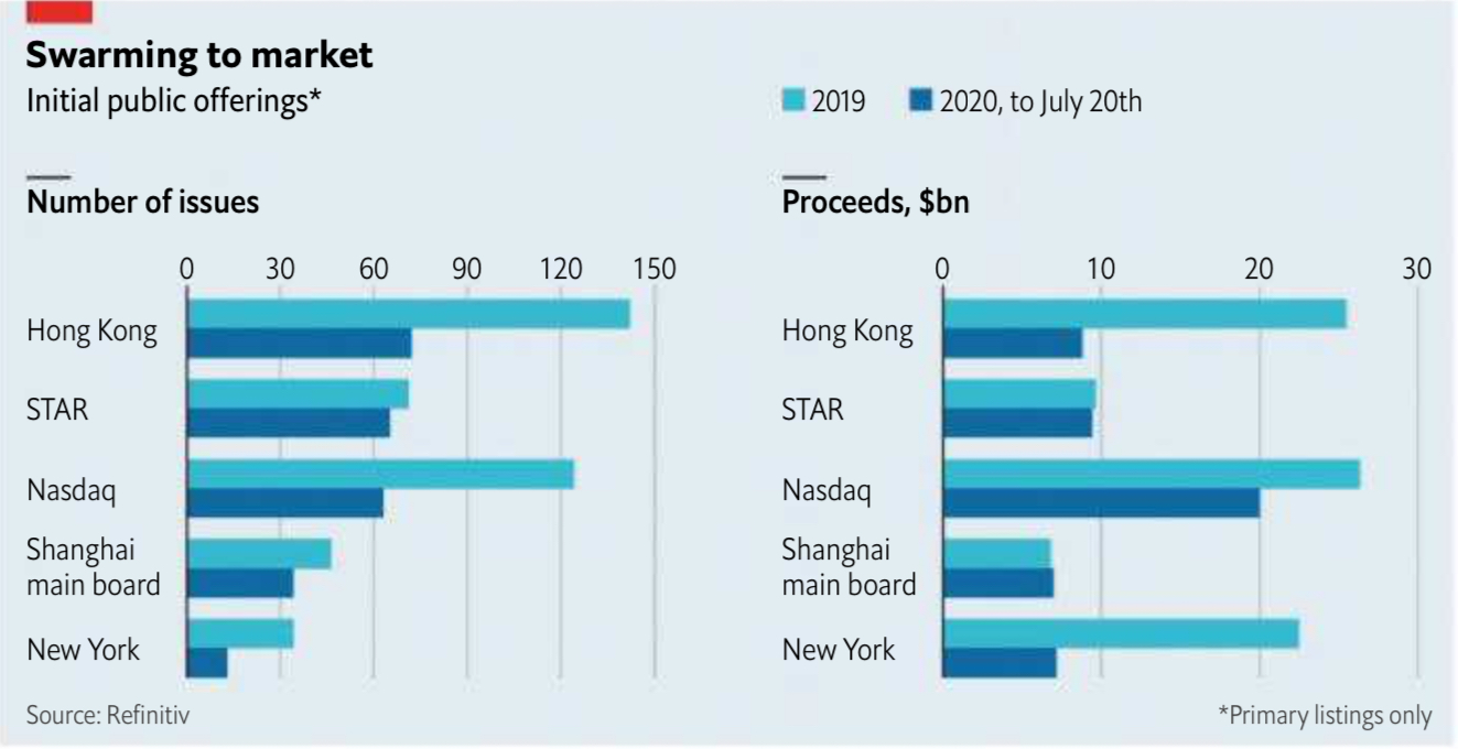 经济学人的一张图展示了中美交易所在 2019 和 2020 上半年的 IPO 业绩,左边是 新上市公司数量、右边是募资金额。