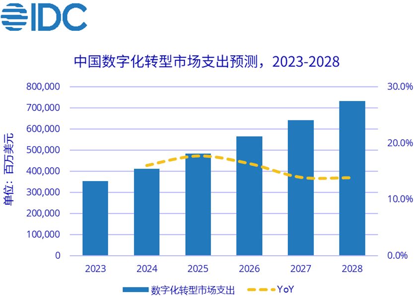 IDC 预计 2028 年中国数字化转型支出规模预计达到 7,330 亿美元,全球占比约 16.7%,五年复合增长率约为 15.6%。