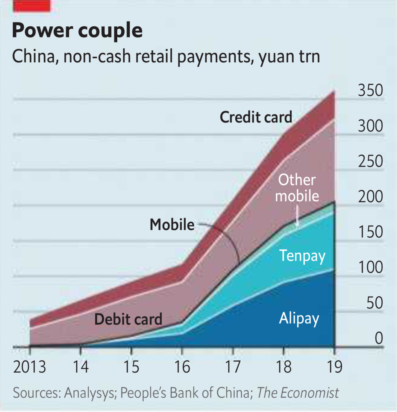 经济学人绘制了一张图,中国大陆每年的无现金支付情况,几种典型支付的交易额构成。