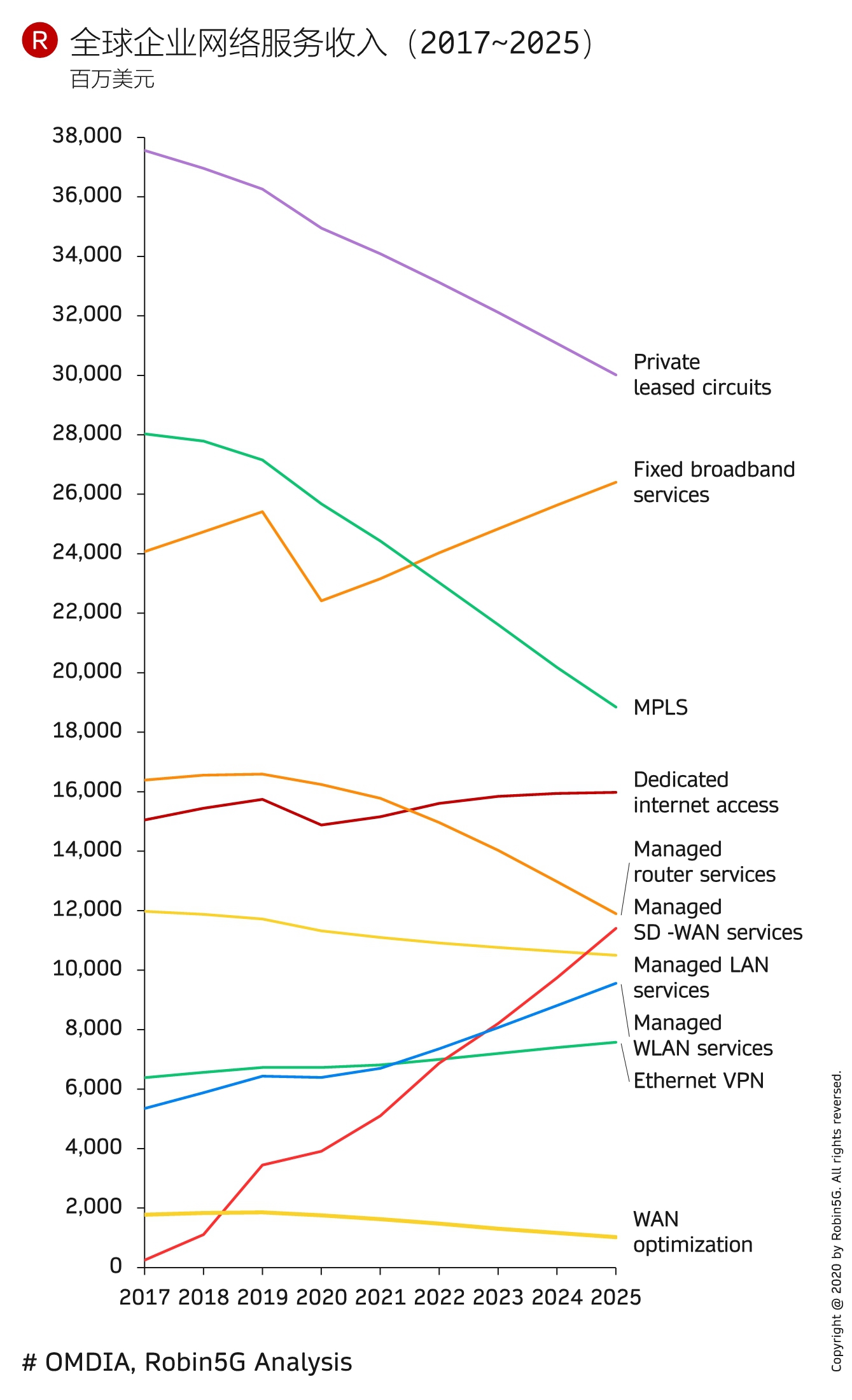 (2) 降幅大的方向:MPLS、电路出租、Managed LAN;