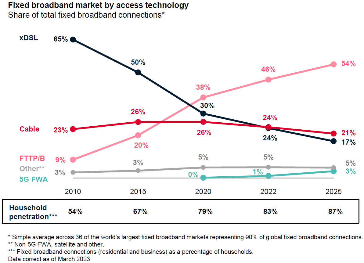 预计到 2025 年,FTTP/B 可占到 54%(仍为达到 xDSL 2010 年的高位),也侧面反映了固定宽带正在呈现多技术发展的态势。