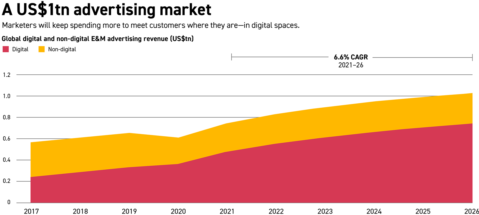 PwC 预计到 2026 广告收入总数字将突破 1 万亿美元,2022~2026 的年复合增长可达 CAGR 6.6%.