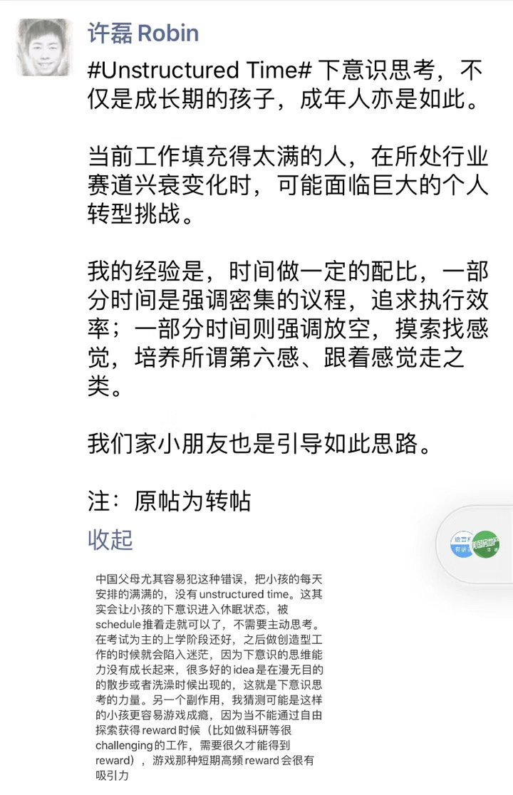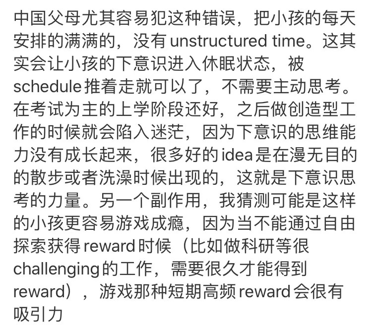 b) 孩子有足够的“留白空间与时间”,即:Unstructured Time。孩子既要善于在给定赛道去自我驱动,更应锻炼在面对丛林时,非结构化空间中的独立勾勒赛道的能力。
