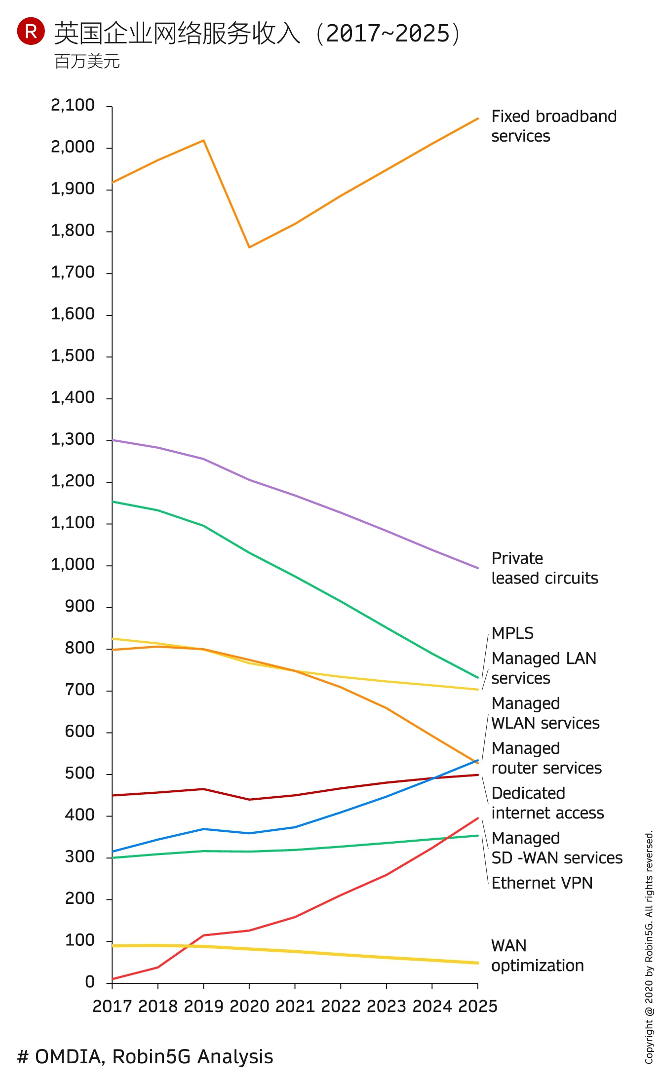 #国际市场# 英国企业网络服务各细分方向的收入空间(2017-2025)
