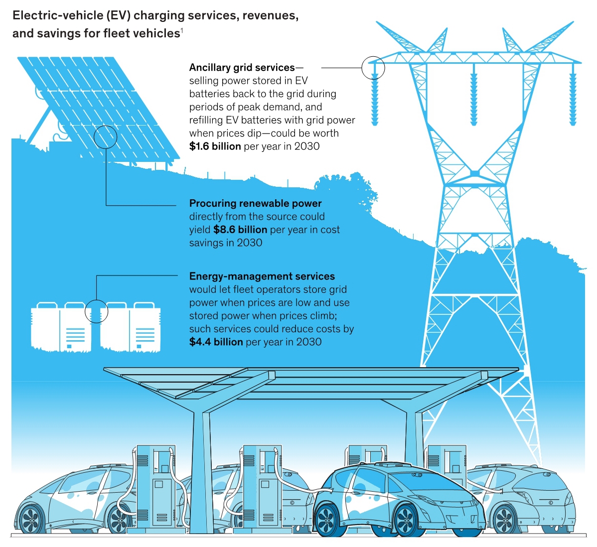 (3) Energy-management services 储能管理服务:车队运营者再电价低时,用电池组等手段批量存储电能,价格高时再使用这些电能。—— 此项收入或成本的节省空间为:44 亿美元@2030年。