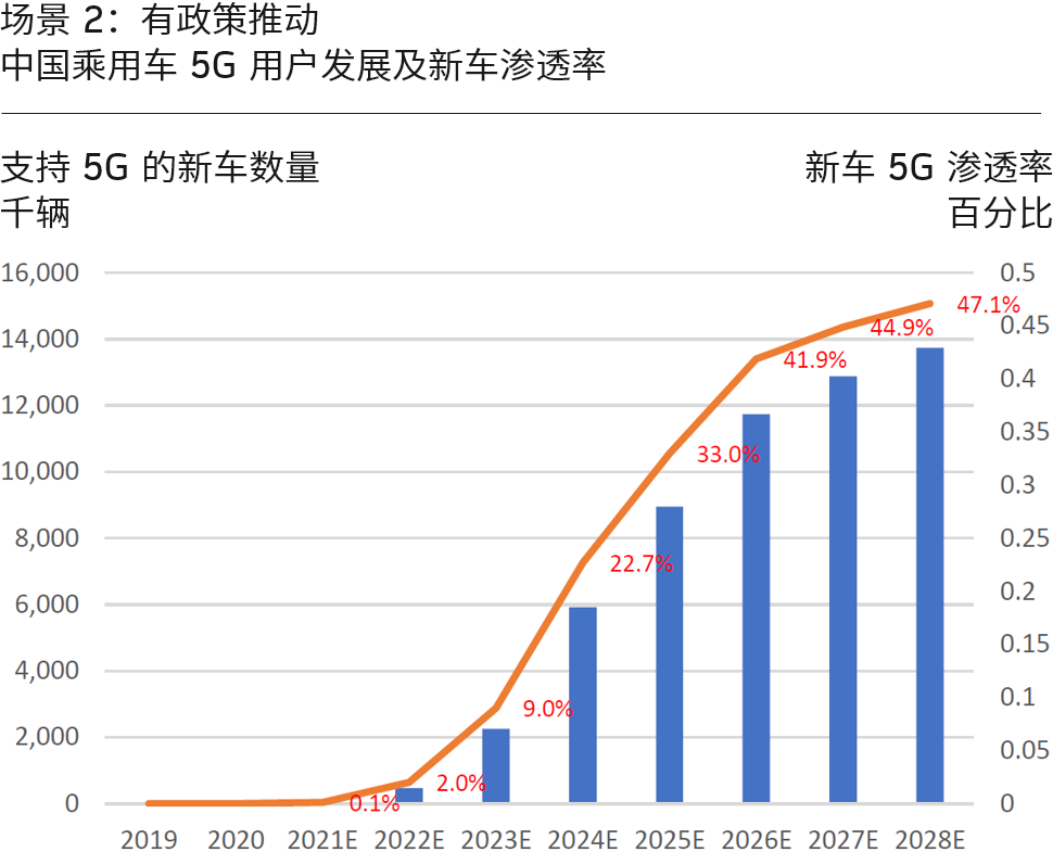 场景2:有政策推动,主要指 V2X 的部署与安装。预计到 2028 年,新车 5G 渗透率可达 47.1%,支持 5G 的新车数量近 1,400 万辆。