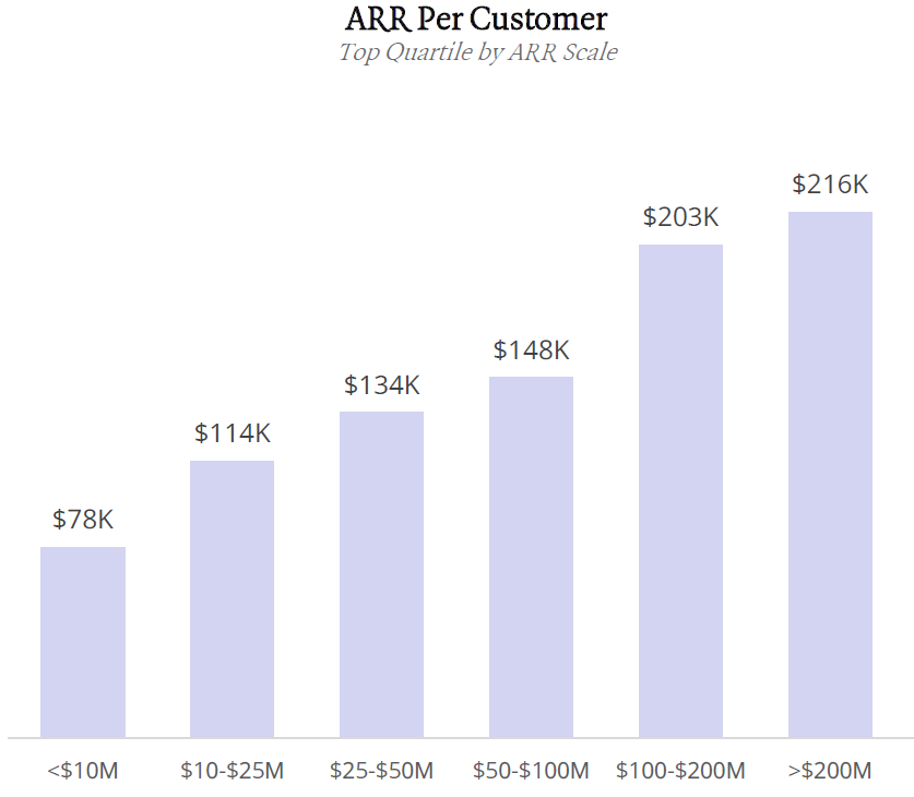 风险投资机构 ICONIQ Capital 根据旗下所投资 SaaS 企业的调研数据显示,以每个客户贡献的收入(ARR 年化收入)的前 25% 分位为例,大型企业(公司 ARR 2 亿美金以上)为 21.6 万美元。