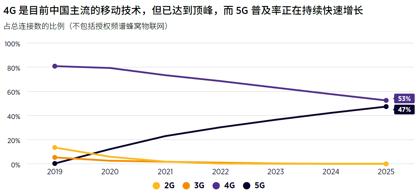 以欧洲市场为例,预计 2022 年 4G 将达到用户占比的最高峰,随后持续降低;预计到 2025 年,欧洲市场 40% 用户为 5G,54% 为 4G,3G 和 2G 则合计降低到 6%。
