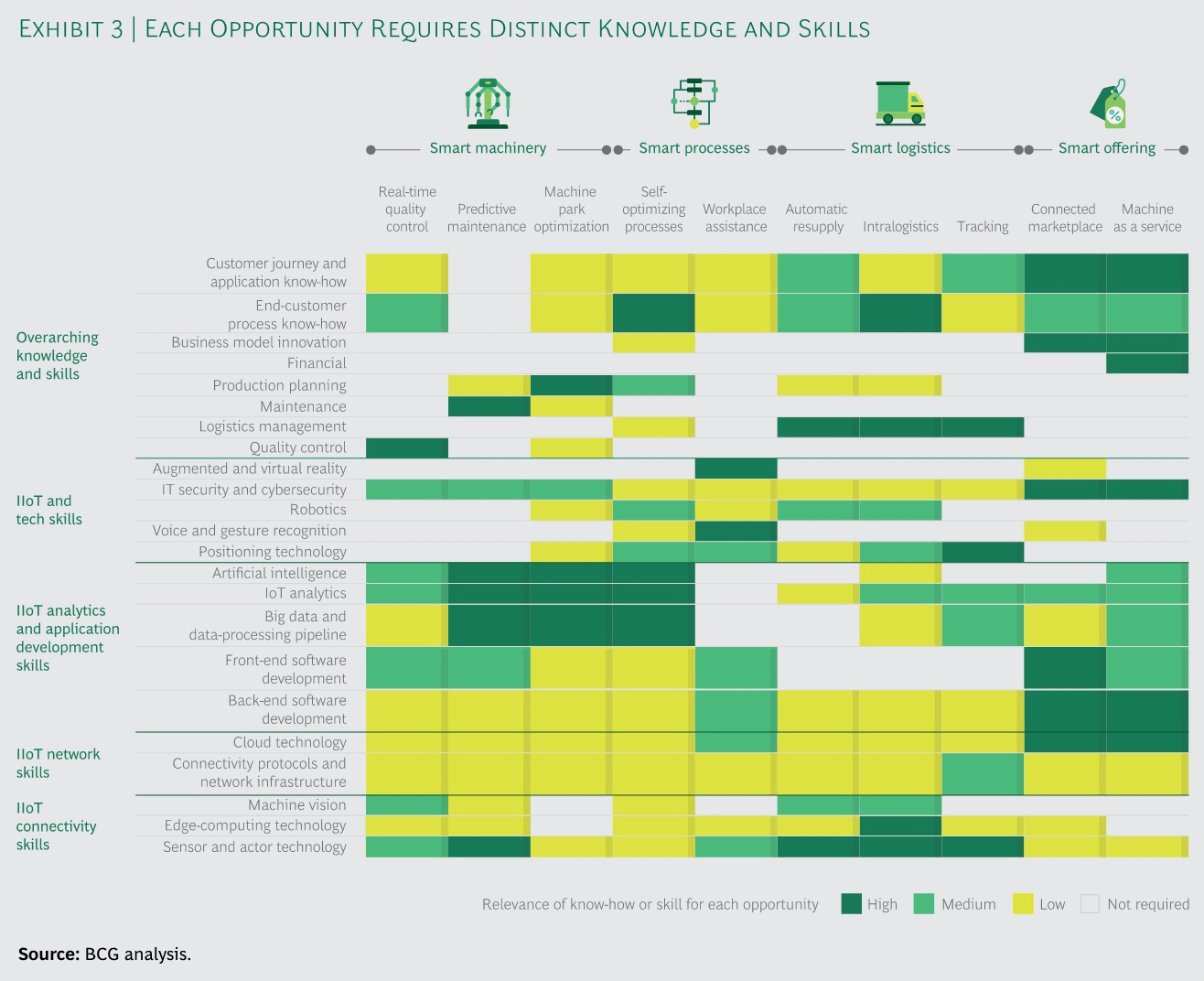BCG 做了一个汇总,针对典型的 IIoT 四大类应用需求(机械控制与维护、生产流程、物流及仓储、智能化产品)所需要的知识相关性。