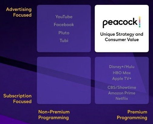 Peacock 目前包括三个层次:(1) 免费版:含广告,有限内容;(2) 4.99美元/月,全部内容,但还有广告;(3) 9.99 美元/月,全部内容,无广告。