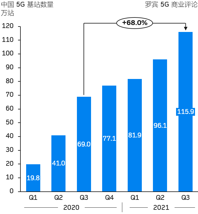 2020 年中国有 72 万个 5G 进展,到 2021Q3 这个数字提升到了 115.9 万站。