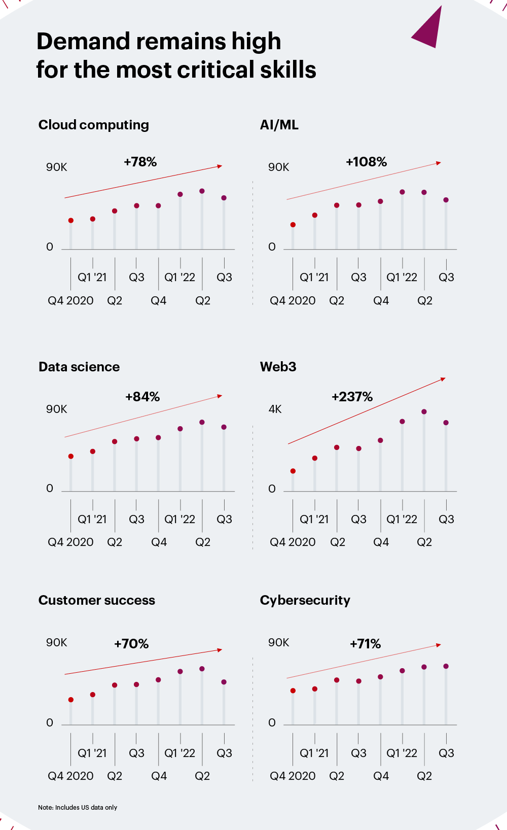 受制于经济形势,美国大型科技公司在 2022 年下半年掀起裁员潮。但贝恩咨询认为从就业市的职位发布数据看,有六类科技类岗位会保持高速增长趋势,分别是:(1) 云计算;(2) AI/ML 人工智能与机器学习;(3) 数据科学;(4) Web3;(5) 客户成功;(6) 网络安全。