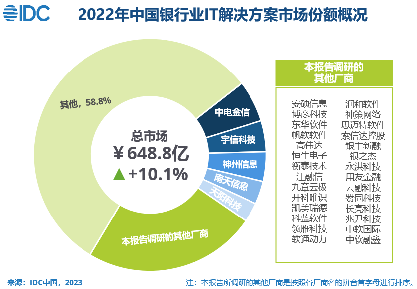 就下图玩家份额看,金融 IT 解决方案的市场格局比较分散,还未出现 “赢家通吃” 的局面。