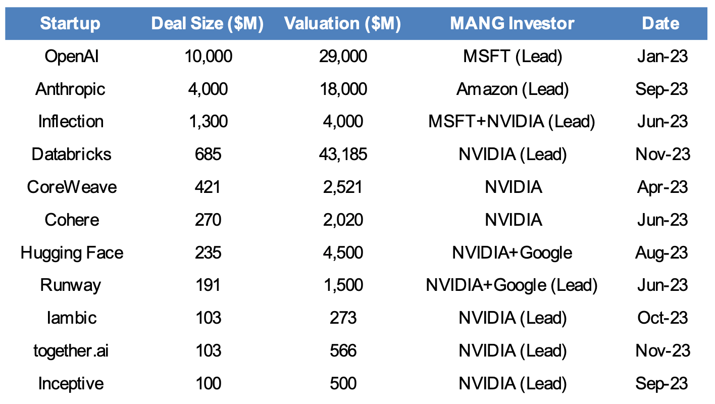 Altimeter 汇总了一张表(图一)展示了 Microsoft、Google、Amazon\AWS、和 Nvidia 在过去十年风险投资案例的变化。