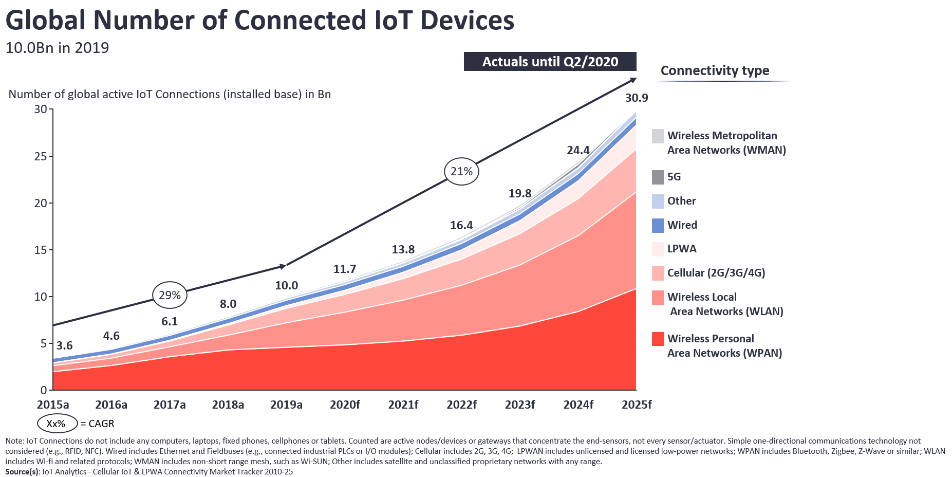 IoT Analytics 咨询公司的一项研究,其估算了 2015 到 2025 全球各类物联网设备的数量(根据网络接入技术)。