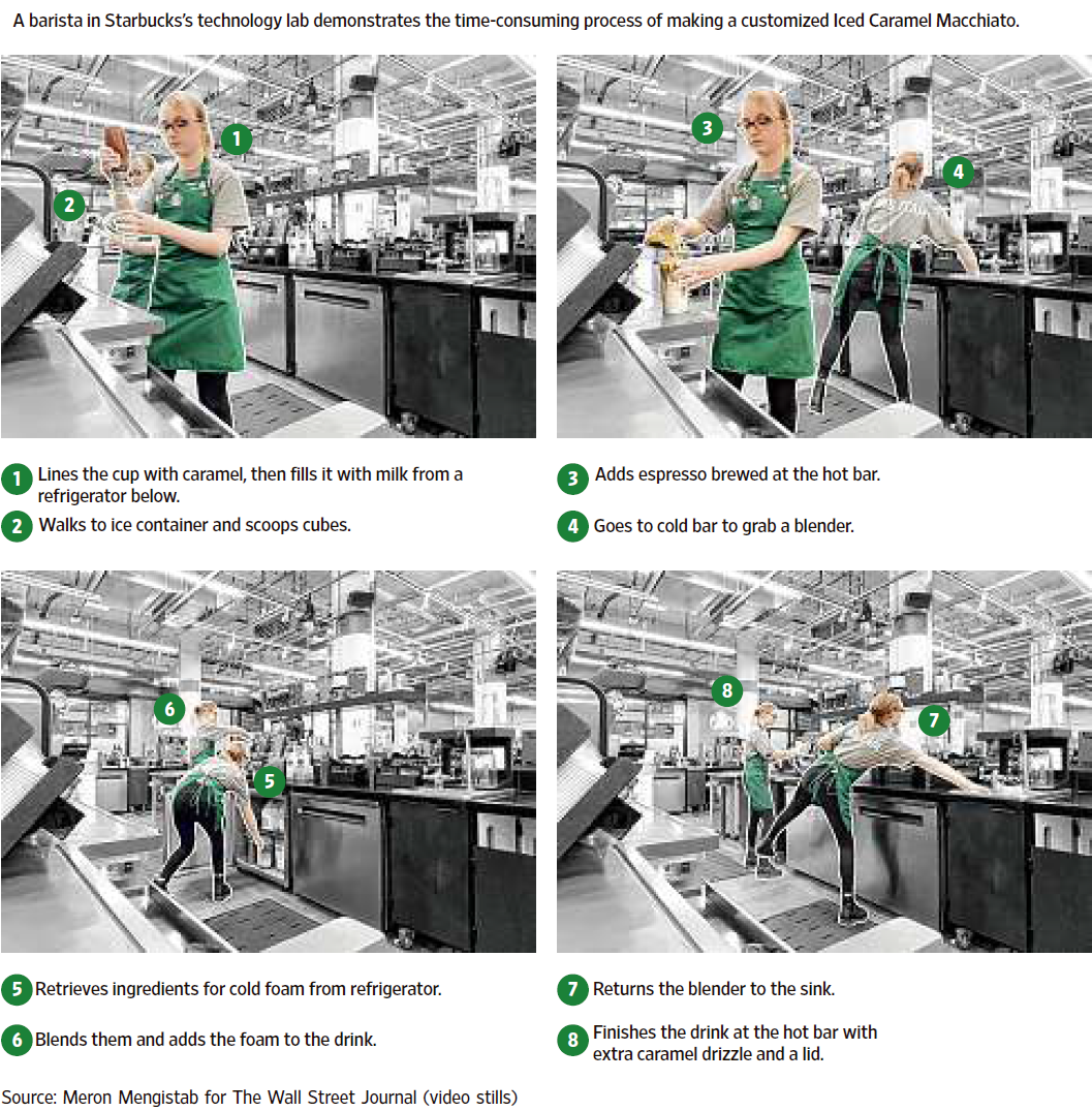 在 WSJ 读到一些星巴克如何做产品研发的介绍。下图是星巴克技术实验室的一位咖啡师演示了制作定制冰焦糖玛奇朵的耗时过程。