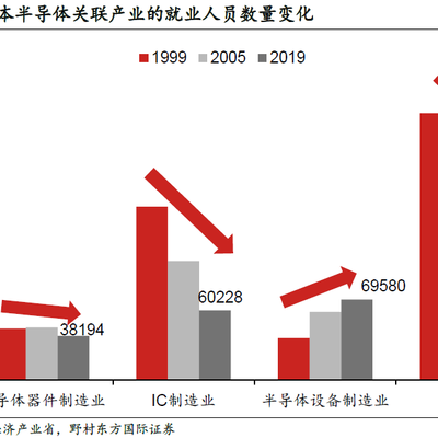 野村证券绘制了一张表,展示了半导体产业的几个关键类别在日本的就业人员变化。