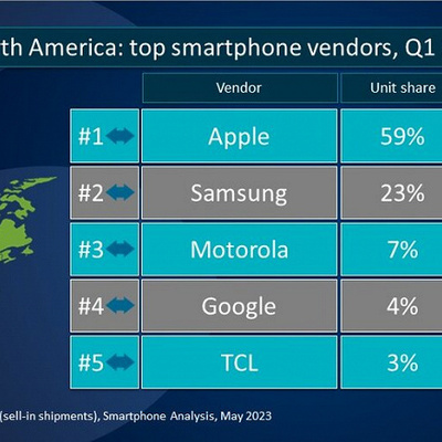 根据 Canalys 的研究,Google 2023Q1 在北美的出货量同比增加了 20%,时长份额达到了 4%,位居北美第四名。