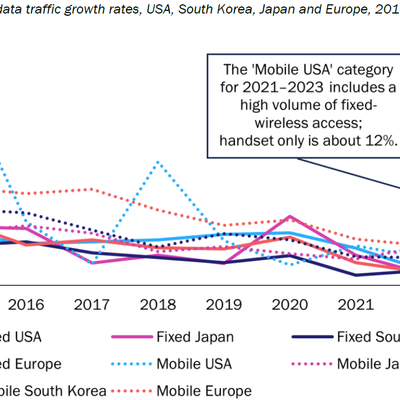 从整体来看,增速持续放缓是大趋势。但美国的移动流量在 2023 年有一个明显的增幅上升,这是因为 5G 固定无线接入(FWA)发挥了大的作用。