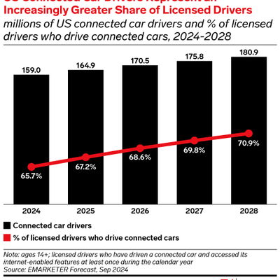 eMrketer 数据显示,2024 年美国车联网车辆用户数为 1.59 亿,预计到 2028 年可达 1.809 亿。