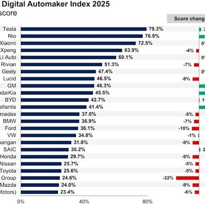 在 Gartner 2025 版数字汽车制造商指数排名(Gartner Digital Automaker Index 2025) 中,特斯拉、蔚来、小米、小鹏、理想位居 Top 5。