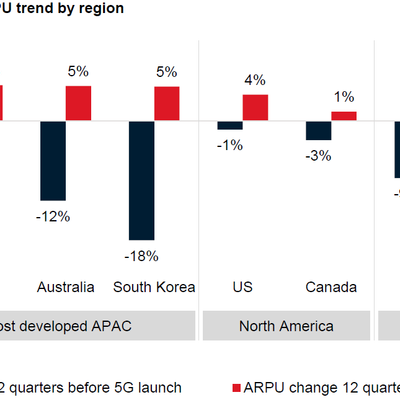 (1) 中日韩和澳大利亚:5G 上市后 12 个季度与 5G 上市前 12 个季度,ARPU 改善非常明显。从两位数的负增长到了单位数的正增长;