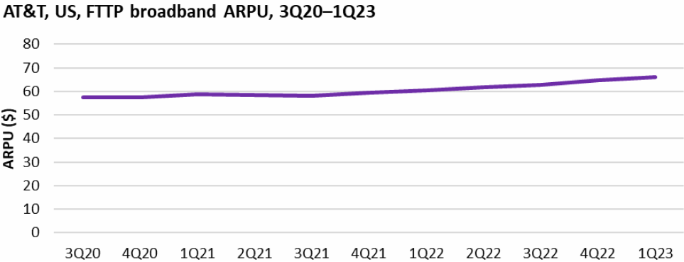 从 ARPU 数据看,AT&T 在 2023Q1 的数据接近了 70 美元/月。而 2020Q3 ARPU 数据还不到 60 美元,增幅还是很明显的。