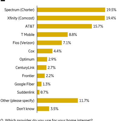 排名第一 Spectrum(Charter)和 Xfinity(Comcast)都是广电运营商,AT&T、T-Mobile 和 Verizon 位居第三到五位。