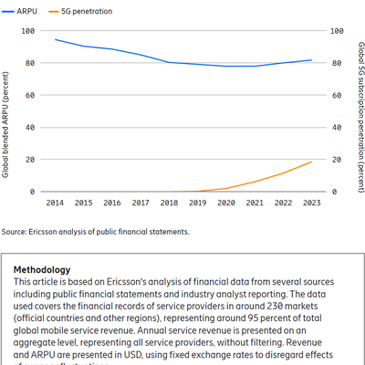 蓝色线条是全球平均 ARPU 的指数变化,橙色是 5G 在全球的用户渗透率的变化。