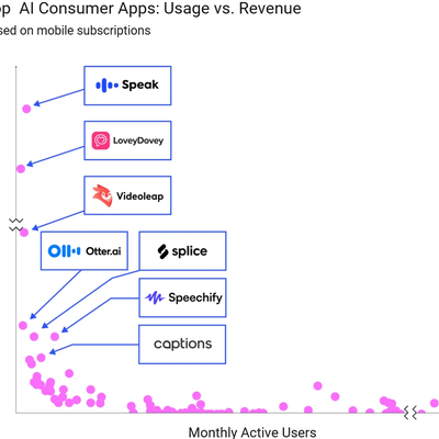 风险投资机构 a16z 的研究显示,当前头部 AI 消费者应用中,用户量大的应用 ARPU 很低,而某些(活跃)用户量小的应用则呈现了高 ARPU。