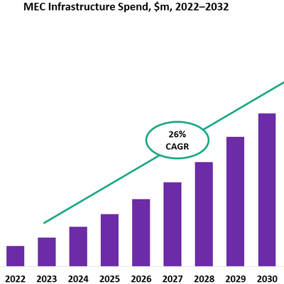 OMDIA 咨询公司认为,从 2022-2032 年全球 MEC 基础设施的开支将保持 26% 的年复合增长率。预计到 2032 年会突破 70 亿美元,其中硬件会占到三分之一,虚拟化软件部分占比 40% 左右。