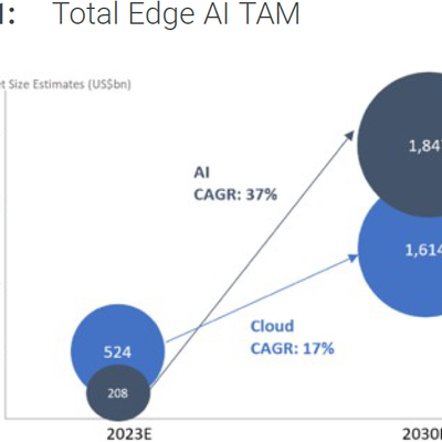 预计到 2030 年,边缘 AI 的总目标空间为 1.8 万亿美元,会超过云计算的 1.6 万亿美元。