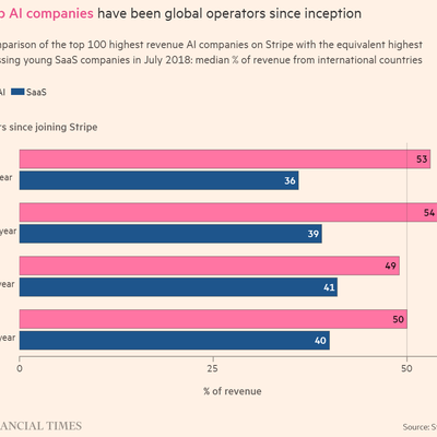 支付服务商 Strip 数据显示,对比其平台接入顶尖 AI 初创企业从一开始就是从多个国家来获取收入。