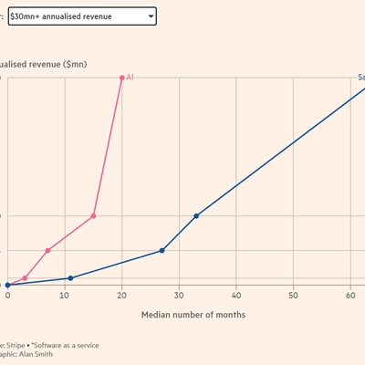支付服务商 Stripe 数据显示,成功的 AI 初创企业可以在 20 个月内实现年化收入 3,000 万美元这一里程碑,是传统 SaaS 创业公司的 5x 倍。