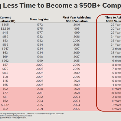 Redpoint Ventures 列出了代表性软件和科技公司(非硬件)从公司成立初始,到市值或估值 500 亿美元所花费的时间。