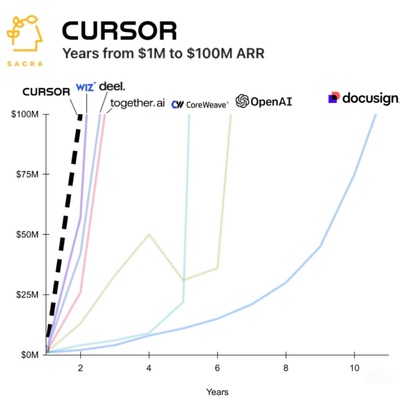 Cursor 作为当红的 AI 编程工具,其在不到两年实现了 1 亿美元的 ARR 年化收入。