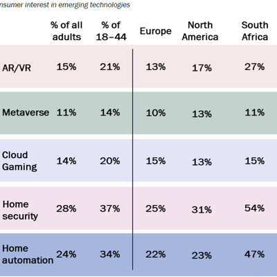 Analysys Mason 在 2023Q3 对全球 18,000 消费者的调研显示,用户使用家庭自动化和家庭安全业务的兴趣远高于云游戏和 VR 类。