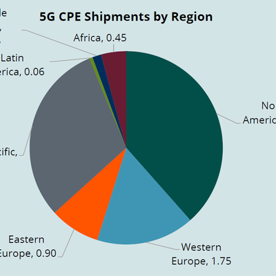 就 5G CPE 而言,北美是最大的需求区域,共计出货 411 万部。北美家庭固定宽带的新增用户很大比例都是基于 5G 技术。