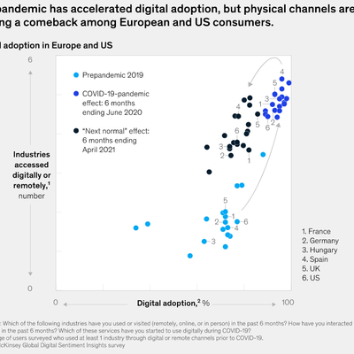 但随着疫情影响的减少,尤其是美国和欧洲的许多地方出行正常化,消费者之前被 “刺激” 激增的数字化行为,变得有些回撤(到物理渠道)。