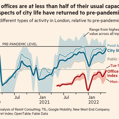 公共交通大约恢复到了 60~70% 左右。而写字楼办公室的使用率看,周二到周四恢复到了 50%,周一和周五则只有 30~40%。