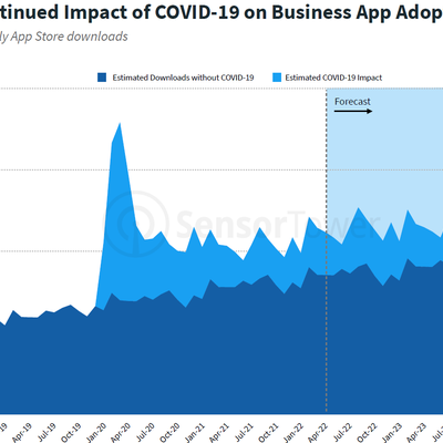 Sensor Tower 模拟了如果没有新冠疫情 AppStore 商业类 App (远程工作、视频会议、团队协作等)的下载次数,以及对比了实际的下载次数。