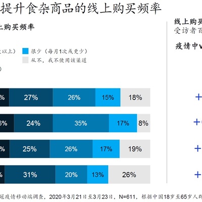 根据麦肯锡的调研,无论是一线、二线城市还是三四线,疫情前后的线上购买食杂频率基本都提高 60~80% 以上。